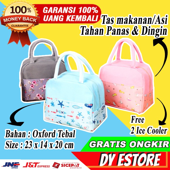 GARANSI 100% UANG KEMBALI Jika Barang Tidak Sesuai PesananSyarat :Video Unboxing paket pesanan yaLunch atau cooler bag hadir lagi dengan motif polos. Buka tutup menggunakan resleting, bagian depan tas terdapat 1 sekat untuk tempat selipan sendok garpu, tissueCooler bag adalah tas dengan lapisan penahan panas atau dingin. Cocok dibawa berpergian karena mampu menahan panas atau dingin makanan. Bisa untuk tempat bekal makan siang ke sekolah atau ke kantor agar panas makanan tetap terjaga. Juga dapat diisi minuman dingin saat berpergian jauh, agar bisa menikmati minuman dingin di perjalanan.Cooler bag dilengkapi 2 pcs jelly ice cooler pengganti es batu, fungsinya agar makanan yang dingin tetap terjaga dinginnya. Jelly ice cooler tidak mudah cair, bentuknya seperti es batu, dapat bertahan dingin 10 - 12 jam. Jelly ice cooler dapat dipakai berulang-ulang.Bisa juga untuk tempat Asi, ek krim, es potong, botol minuman dan sejenisnyaCara pemakaian jelly ice cooler :- Isi air melalui mulut kantong jelly ice cooler, isi hingga 3/4 penuh- Masukkan jelly ice cooler ke dalam freezer hingga beku- Jelly ice cooler dapat bertahan dingin 10 - 12 jam, setelah pemakaian anda dapat mengisi kembali jelly ice cooler dengan air dan kembali dimasukkan ke freezer dan dapat digunakan untuk pemakaian berikutnya.Material : Oxford Tebal + Lapisan penahan panas / dingin, bahan anti airSize : 23 x 14 x 2