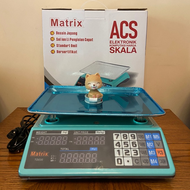 TIMBANGAN MATRIX TD030Timbangan ini dilengkapi dengan layar LCD depan dan belakang untuk memudahkan penjual dan pembeli melihat hasil berat dan harga barang yang ditimbang. cocok untuk laundry, sembako, pakaian, dan lain lain- Merek MATRIX- Terdapat 3 display : Berat , Harga satuan , dan harga total- Kapasitas : 30kg- Ketelitian 10 gram- Red led display- Plat Size 36cm x 36.5cm- Display Depan Belakang- Menggunakan batere seperti aki kering yg dapat dicharger (AC 220v/110v and bulit-in Rechargeable Battery)- Display windows : weight 5 digits, unit price 5 digits, Total Price- Tare indicator, zero indicator, Low battery indicator, AC power indicator Non Garansi : barang sebelum di kirim di cek dahulu, tapi tidak ada garansi pengiriman expedisi Garansi : barang sebelum di kirim di cek dahulu , garansi pengiriman aman, jika terjadi peyok rusak barang akan di ganti 100% Bubble bubble : barang sebelum di kirim di cek dahulu , packing bubble luar d