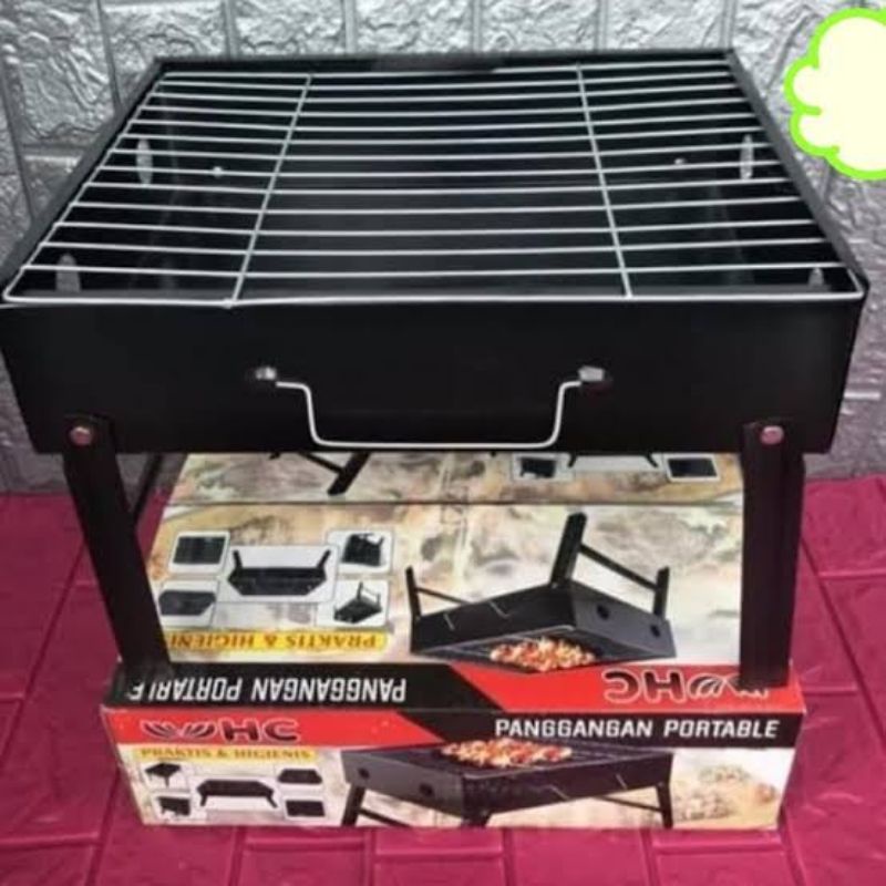 Panggangan portable Hanya digunakan diluar ruangan dan di gunakan arang sebagai bahan bakar. Lapisan penampang baja tahan panas kisi kisi yang dilapisi stainless krom.body dalam lapisan antikarat dilengkapi pegangan yang nyaman untuk menentengnya saat dibawa kemana mana. Alat panggangan ini dapat dilipat sangat cocok untuk di bawa kepantai pergi perjalanan berkemah atau dimanapun yang diinginkan.. Selain pemanggang ini bisa dilipat tapi mudah juga untuk dibersihkan. Mendukung untuk acara besar atau pesta barbeque kamu dapat memanggang banyak jenis daging, sosis dan lainnya dalam waktu yang singkat Kaki yang dilipat juga dapat memudahkan kamu untuk menyimpan didalam ru