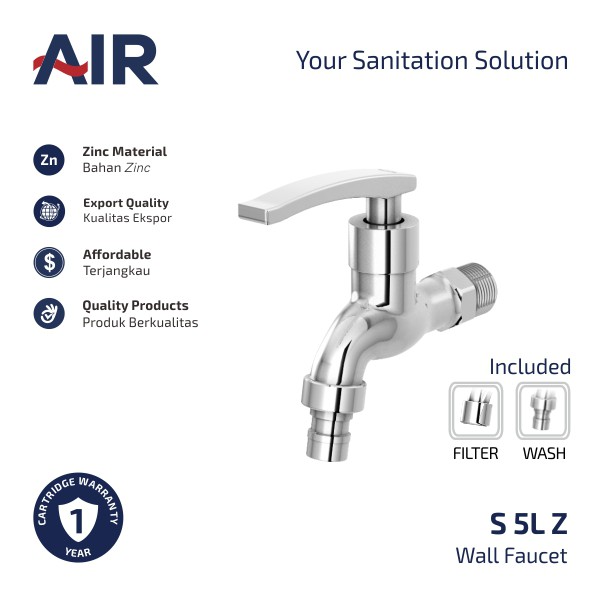 Deskripsi AIR Kran Air Keran Tembok Wall Faucet S 5L Z[READY STOK]Estimasi pengiriman: Jabodetabek 4-7 hari kerja, luar Jabodetabek 5-14 hari kerja. Order masuk > jam 11.00 ikut pengiriman besok (termasuk JNE YES).- Kran tembok air dingin untuk instalasi pipa 1 / 2 inch- Bentuk design simple dengan handle berbentuk stick- Memiliki warna chrome yang mengkilap- Ekonomis dan mudah dalam pemasangan- Panjang x lebar x tinggi: 11 cm x 7 cm x 10 cm- Ujung kran bisa disambungkan dengan selang mesin cuci dan tidak bocor- Cara pakai nya adalah dgn memutar posisi stang dari posisi semula ke arah berlawanan jarum jam 90 derajat dari off ke on- Perbedaan dengan S 5M NZ adalah S 5L NZ ada sedikit lengkung ke atas di bagian ujung handle nya. S 5M NZ tidak ada sedikit lengkung ke atas di bagian ujung handle