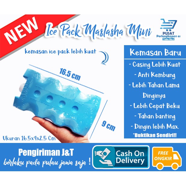 ice pack pendingin blue ice pack blue ice es packultracool blue ice pack pembeku es maslaha ice pack kotak ultracoolSpesifikasi Maslaha Ultracool kemasan botol lempengUkuran : 16,5 x 9 x 2,5 cmBerat : 450GrWarna Gel : BiruTahan Dingin = 10-12 jamDapat digunakan 2-3 tahunSuhu : - 25 derajat Celcius ( +30 pcs)Bisa digunakan berulang kurang lebih 3 tahun, karna dikemas dengan baik tahan berat orang dewasa 100 kg ( tahan banting ) bisa dibuktikan. Pengusaha bisa hemat biaya hingga 70% bahkan lebih dengan menggunakan Maslaha Ultracool ini ..Produk ice pack maslaha kami sudah banyak digunakan pelaku - pelaku usaha ekspotir olahan ikan, tpi ( tempat pelelangan ikan ), nelayan, frozen food, dll ..Teknologi dengan Kemampuan :- Menyerap & Menyebarkan Energi Dingin- Mencapai suhu -25 C Hanya dengan 30 pcs - Dapat dipakai berulang hingga 3 tahununtuk mendapatkan manfaat maksimal maslaha hal yang penting dilakukan :Pengisian energi dingin / charging :- gunakan freezer untuk mencapai suhu maksimal- untuk pembekuan pertama kali dilakukan selama 2 x 24 jam (HARUS)- untuk selanjutnya cukup minimal 12 jam s/d 18 jam - maslaha yang siap digunakan warnanya biru muda dan jika dibenturkan terdengar keras dan padat Pemeliharaan :- sebelum dibekukan sebaiknya dicuci dan dilap terlebih dahulu - jangan terkena sinar matahari secara langsung saat tidak digunakanKomposisi :- maslaha terdiri dari 8 unsur senyawa kimia yang aman tidak beracun- meskipun maslaha tidak beracun, tapi diusahakan jangan dimakan atau diminum- jika maslaha bocor dan produk yang disimpan dengan maslaha terkena, cukup dibersihkan dengan air bersih dan tetap dapat dikonsumsi Perhatian !!!PASTIKAN ANDA MEMBELI PRODUK MASLAHA YANG ASLI ! kami menyarankan untuk memilih produk yang benar - benar menjaga kualitas, konsisten dengan produknya sehingga didalam aplikasi sehari - harinya tidak mengecewakan#icepack #pendingin #blueicepack #blueice #espack #ultracoolblueicepack #pembekues #maslaha #icepackkotak #ultrac