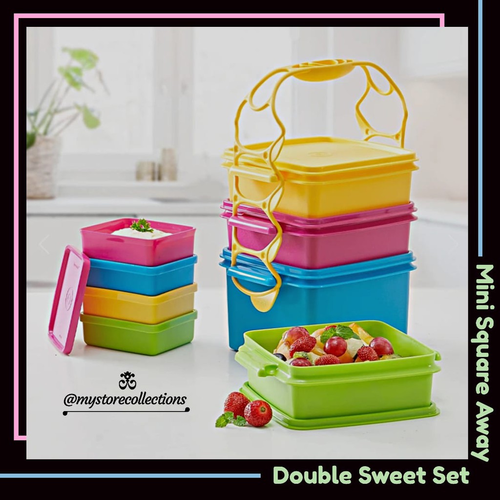 Double Sweet Set + Free (Rantang) TupwrUkuran : a.Double sweet @900 ml / 16.4 x 16.4 x 5.7 cm (3 Pcs)b.Double Sweet @1.8 ml / 16.4 x 16.4 x 10.7 cm(1 Pcs)c. Mini Square away @90ml / 10.3 x 8.6 x 3.4cm(4 Pcs)Tak perlu khawatir saat ingin membawa banyak makanan untuk piknik atau menghabiskan weekend seharian di luar rumah bersama keluarga. Mengerti akan hal tersebut, Tupperware menghadirkan Double Sweet Set untuk menjawab kebutuhan Anda dan keluarga, mampu membawa empat menu sekaligus dalam satu jinjing.Fitur Double Sweet Set :1.Terdiri empat wadah makan dengan ukuran sama dalam kombinasi warna-warni cerah, untuk ceriakan acara piknik Anda bersama keluarga.2.Dilengkapi seal ketat udara, untuk menjaga makanan di dalamnya tetap fresh saat disantap. Mau membawa salad, mie goreng, tofu lada hitam, dan gurame goreng ke acara piknik keluarga? Pasti bisa!3.Double Sweet Set memiliki desain unik, pada bagian seal bercekung dan memiliki ukuran yang sama dengan base sehingga mudah disusun. Seal akan mengunci base wadah di atasnya, supaya mudah dibawa bepergian kemanapun.4.Terdapat cariolier yang berfungsi sebagai handle. Kaitkan cariolier pada setiap handle lunchbox, dan Anda bisa langsung membawanya dalam sekali jinjing.5.Jika Anda dan keluarga sangat menyukai menu bento, Double Sweet Set adalah pilihan tepat untuk membawa bekal piknik. Lunchbox yang tidak memiliki divider akan memudahkan Anda menyusun bento kesukaan anak-anak ke dalam wadah, lho.NB: MOHON TANYAKAN KETERSEDIAAN BARANG TERLEBIH D