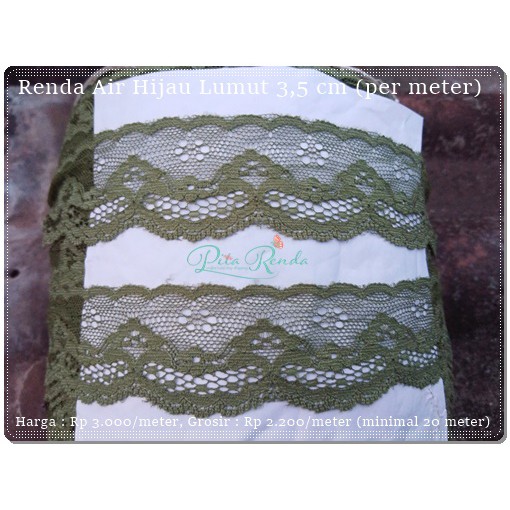 Renda air warna hijau lumut, bisa untuk hiasan box, undangan atau list baju/hijabLebar titik tertinggi 3,5 cmRenda TIDAK MELAR / TIDAK ELASTISHarga : 3.000/meterGrosir : Rp 2.200/meter (minimal 20 meter)Note : Warna bisa beda dengan foto karena efek cahaya / kamera. NO KOMPLAIN !!!!#renda #rendaair #rendahijab #rendaund