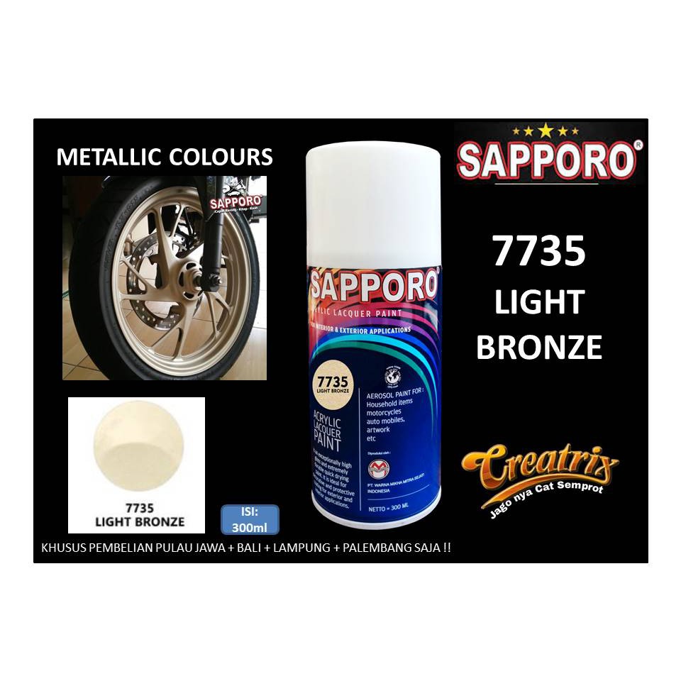 Warna: Lihgt BronzeNo part: 7735Isi: 300mlCat Aerosol SAPPORO adalah cat semprot akrilik dengan kualitas terbaik digunakan untuk permukaan metal, plastik dan kayu. Cocok buat kamu yang pengen cat ulang helm, velg, plat nomor atau body motor biar lebih keren, gaul, dan kekinian.METODE PENGECATANDaya sebar teoritis 1,5 m2 / kalengKocok kaleng selama 15-30 detik, sampai kaleng dalam keadaan terasa bergetar bebas.Pegang kaleng tegak dengan jarak 25-30 cm dari permukaan, semprot dengan gerakan horizontal hingga terbentuk lapisan cat yang tipis dan rata.Kocok kaleng secara berkala selama penggunaan.Semprot 2 atau 3 lapisan tipis dengan jarak aplikasi sekitar 10 menit akan memberikan hasil opt
