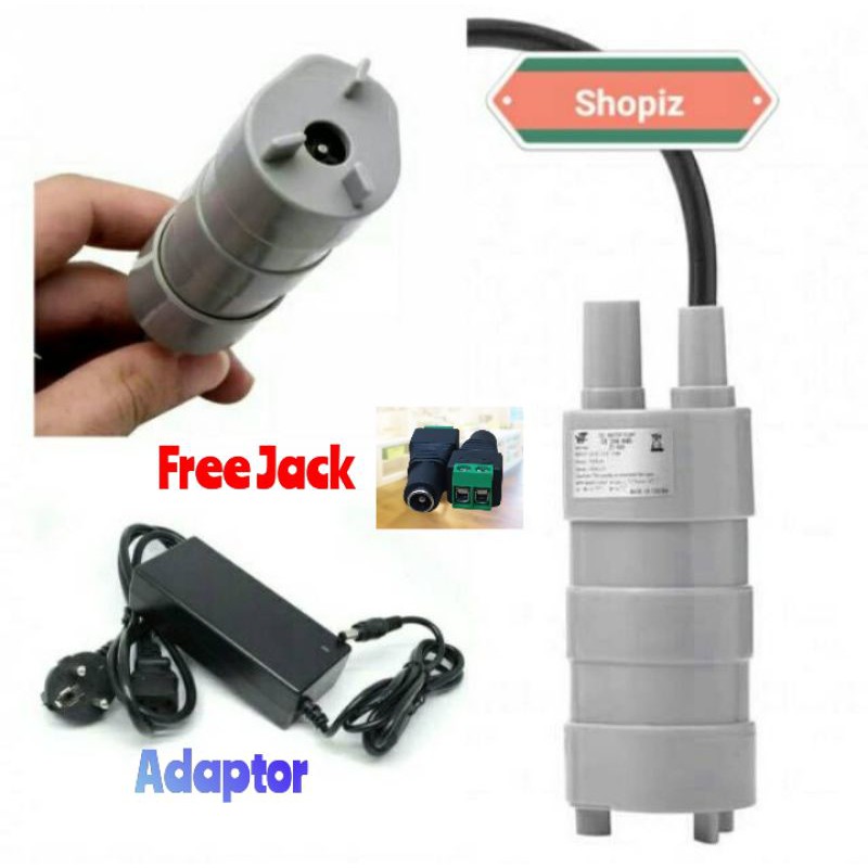 Pompa Air Celup JT-500 + AdaptorDengan pompa ini bisa langsung colok listrik rumah. Jadi tinggal pasang selang saja.Pompa ini bersifat submersible atau tahan air, dapat disimpan di dalam air dan mengeluarkan flow air yang besar 600L/H. Biasa digunakan untuk pompa air di akuarium ikan. Selain untuk kebutuhan akuarium dapat juga digunakan untuk menyedot air dan keperluan-keperluan lainnya.High PressurePompa ini memiliki tekanan air yang kuat sehingga dapat menyaring air akuarium dengan cepat dan merata.Best O2 for FishPompa ini juga dapat dijadikan sebagai gelembung udara ikan di kolam yang besar, flow air membuat ikan tidak cepat mati dan lebih sehat.High Quality MaterialSemprotan berbahan Plastic ABS yang kuat menahan tekanan air di dalamnya. Cara pemasangan yang mudah dan tahan air karena pompa air celup/summersible pump.Technical Specifications :-Material: Plastic-Dimension: 98 mm(height) x 38 mm(diameter)-Water Outlet Outer Diameter: 12 mm-Water Outlet Inner Diameter: 9.7 mm -Cable: three core-Cable Length: 1.5 m-Cable Diameter: 5.7 mOthersRated Voltage: 12VWorking Voltage: 6-12V (Maximum 15V)Rated Current: 1.2A Maximum Lift: 5MNotice: it means height the water can arrive if the u connect a plastic pipe with the pump Maximum Flow Rate: 600L/HourDimensi dari produk ini adalah 10.8 x 4 x 4 cm dengan berat 200