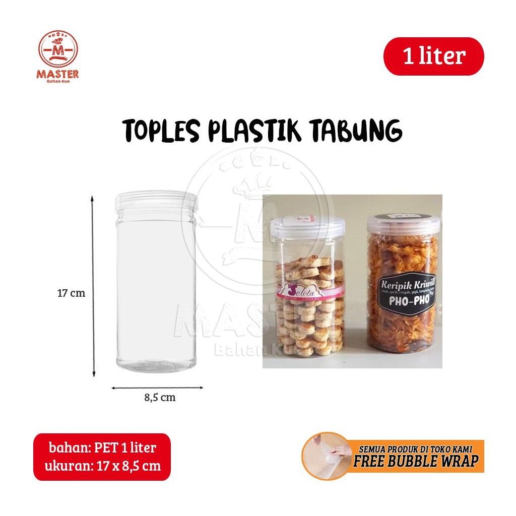 Toples Tabung PET 1 liter untuk Snack Kue Kering Kripik [1 pcs]Bahan: PETTinggi: 17 cmDiameter : 8,5 cmtoples untuk sanck, camilan, kue kering, dll#botol #almondkotak #botolalmond #botolminumplastik #toples #toplespl