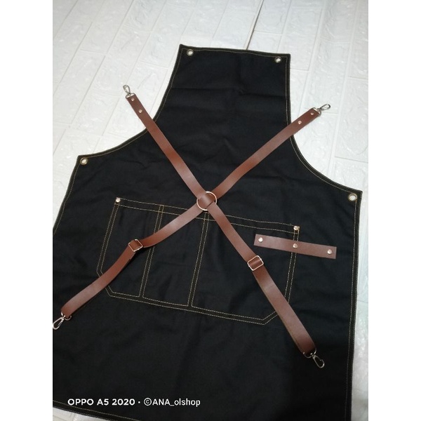 Apron barbershop dn baristaBahan drillPakai furing/kain lapis belakangRingan di pakaiGampang di cuciTali kulit sintetistali bisa 2 modeltali model kalung,pinggang dn model silang ..Untuk stok tanyakan terlebih dahuluReady yg warna hitam